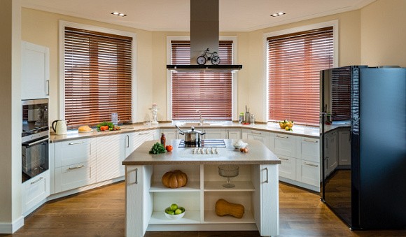 Кухонный гарнитур бежевого цвета с островом отлично подойдет для просторной квартиры-студии. С помощью островной конструкции легко отделить кухонную зону от гостиной. Также ее можно использовать вместо привычного обеденного стола.
