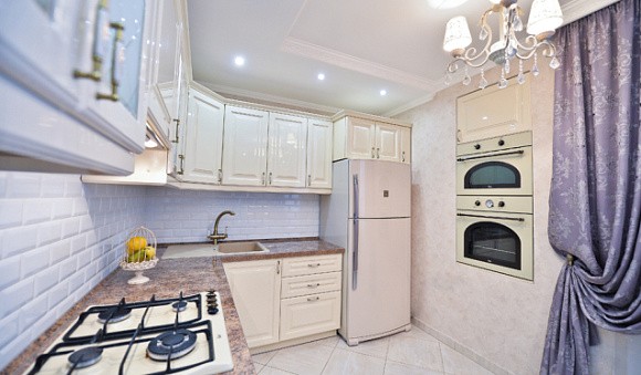 Выбирая бежевый гарнитур, учитывайте его форму, а также архитектурные особенности и размеры помещения, в котором он будет находиться. Так, для небольшой комнаты подойдет прямая кухня с гладкими фасадами. Такой комплект займет место вдоль одной стены, не затенит помещение и не перегрузит его.