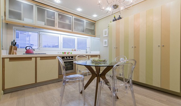 Практичность. Фасады кухни бежевого цвета легко отмываются с помощью мягкой губки и теплой воды.