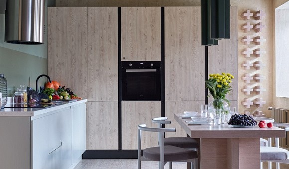 Параллельная кухня будет уместна в узком прямоугольном помещении. При этом важно учитывать, что проход между шкафами должен составлять 1,2-1,5 метра. В этом случае будет удобно пользоваться мебелью и бытовой техникой, перемещаться во время готовки.