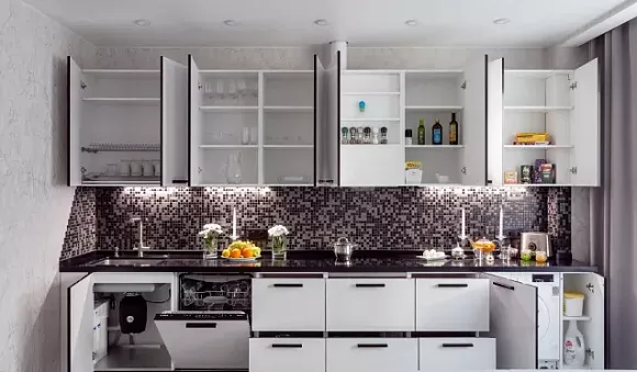 Комплекты в стиле хай-тек – лучшее решение для эргономичного пространства. Для этого направления характерно использование умных систем и утопленных ручек. Подчеркнуть красоту гарнитура позволяют хромированные детали и стекло.