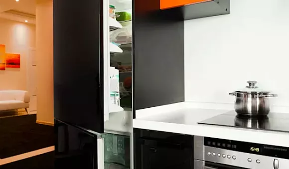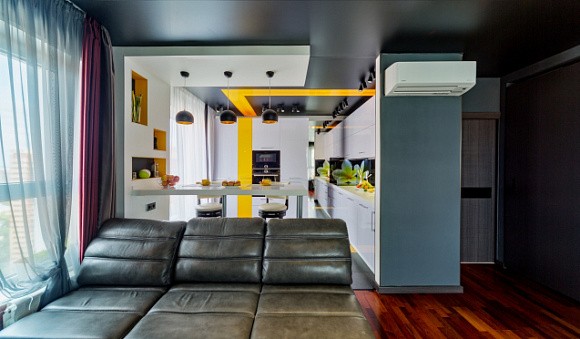 Черный глянец выглядит особенно изысканно и стильно. Подобную расцветку рекомендуется использовать в просторных помещениях, расположенных на южной стороне. Для оформления черных поверхностей используются стальные элементы лаконичной формы.