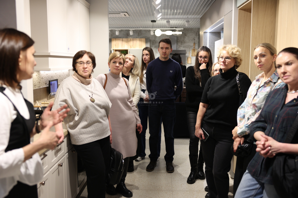 После официальной части гости отправились на экскурсию. Мы провели гостей по трём разным маршрутам, раскрывая особенности каждой зоны. Дизайнеры и менеджеры салона показали: