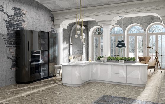Для больших комнат подходят П-образные, островные и двухрядные версии. Расцветка и декоративная отделка моделей может быть любой, так как большая площадь позволяет дать волю фантазии.