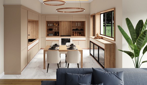 Светлые бежевые комплекты также подходят для небольших площадей. Как правило, их выполняют в минималистичных стилях – модерн, скандинавском, лофт и неоклассика. Поверхности комплектов могут быть как однотонными, так и комбинированными. Довольно часто их декорируют рамками, вставками из стекла и зеркала.