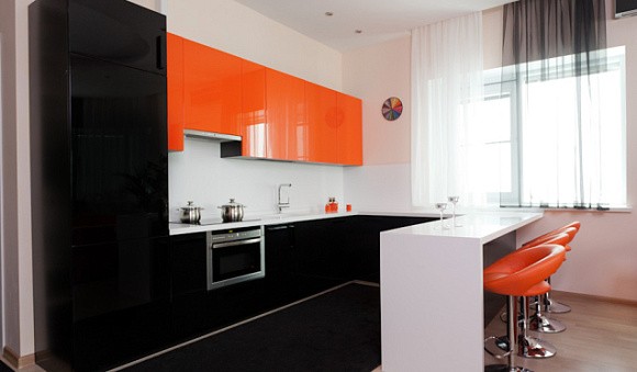 В черном цвете выполняют кухни в стиле хай-тек, лофт, модерн. При этом довольно часто изделия дополняют контрастными вставками. Черно-белые комплекты выглядят весьма привлекательно, не перегружают и не затеняют помещение.