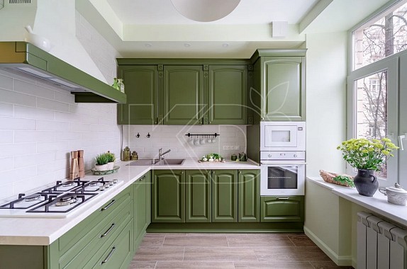 • Возможность реализации разнообразных стилистических концепций. Угловые кухни оливкового цвета хорошо смотрятся как в классическом, так и в современном исполнении.
