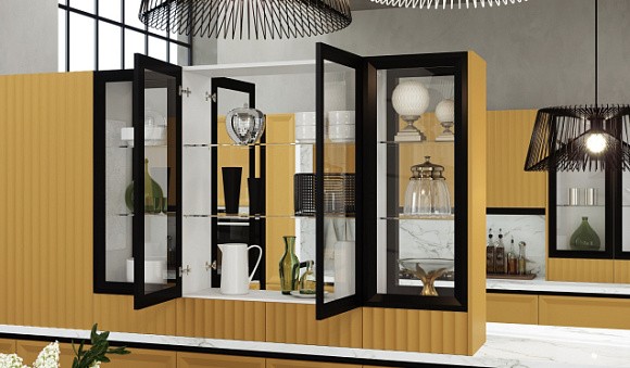 Черные детали подчеркнут строгость и четкость линий. Обычно их используют в сочетании с лимонными, соломенными и ванильными поверхностями.