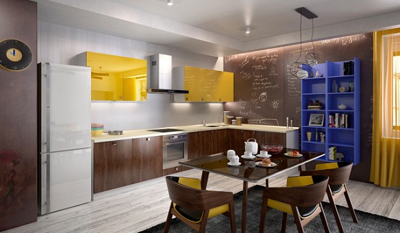 Коричневые оттенки тоже можно использовать для оформления кухни желтого цвета. При этом следует учитывать, что для маленькой комнаты подойдут светло-кофейные и бежевые акценты тона, а для большого помещения стоит выбрать шоколадную или другую темную расцветку.