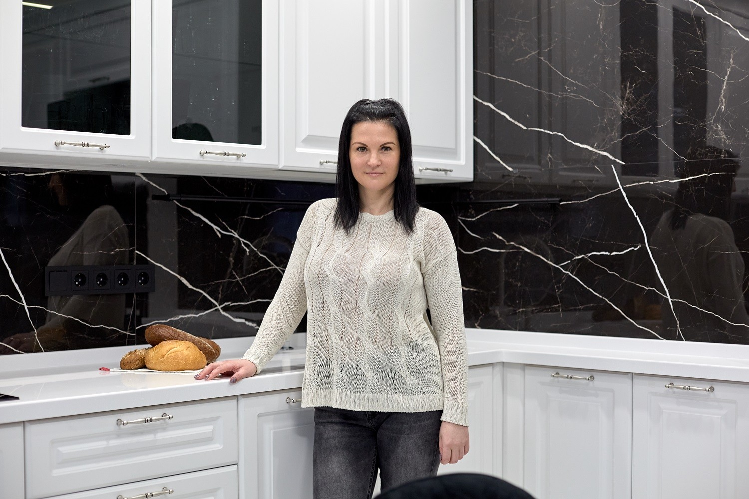 Поздравить есть за что, ведь кухня красивая и комфортабельная. А ещё яркая! Да-да, хоть фасады здесь и белые, в яркости всего образа нет никаких сомнений. Вписывая «Катарину» в интерьер, дизайнеры сделали ставку на классический цветовой контраст. Кухня ярко выделяется на фоне тёмной техники, обеденной зоны, фартука и элементов освещения. При этом белизна её фасадов, цоколей и карнизов расширяет и без того просторное помещение.