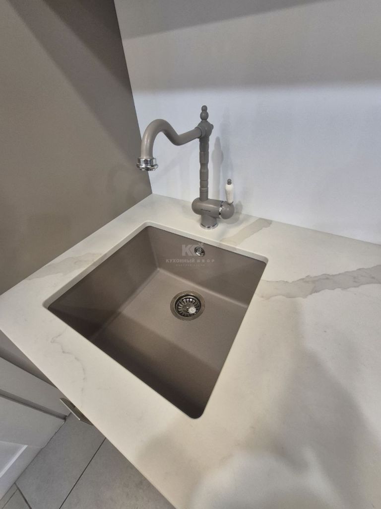 В стоимость образца включена: мебель (корпус Egger, фурнитура Hettich), столешница, мойка подстольного монтажа, смеситель.