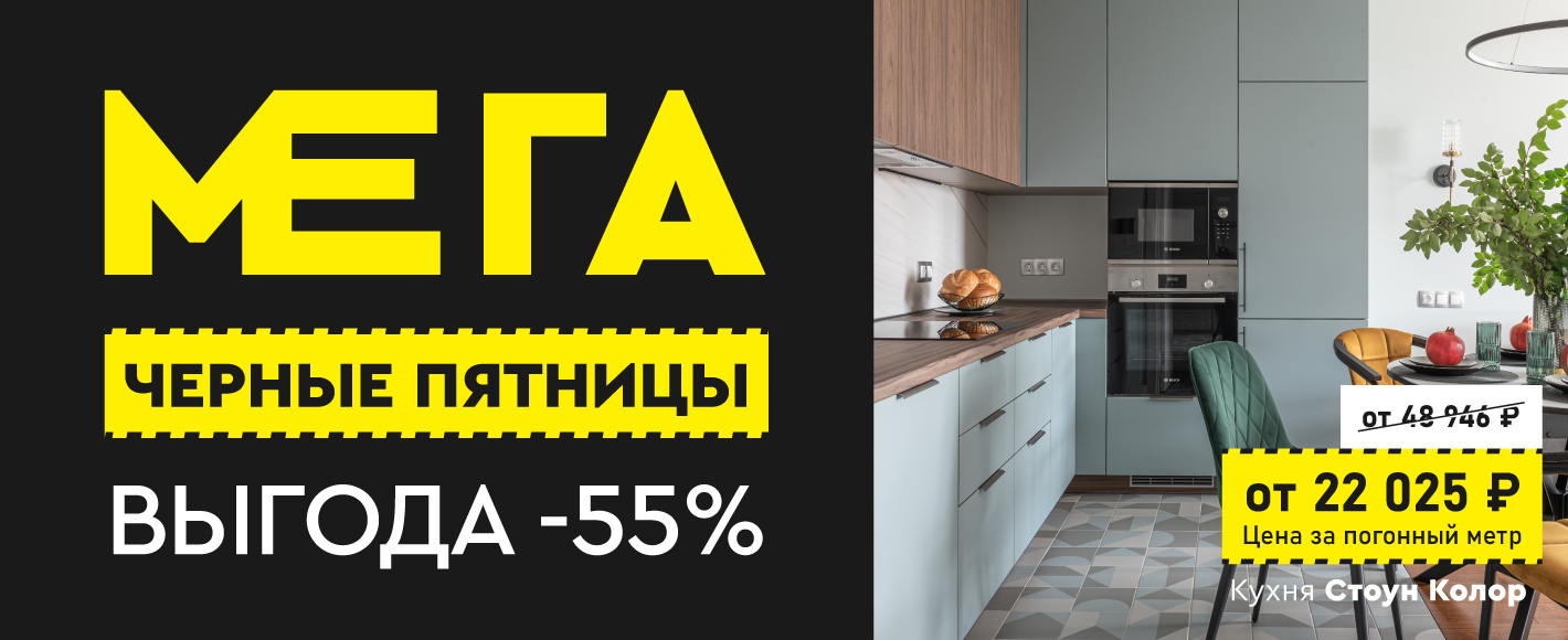 Вы просили, и мы продолжаем самую долгожданную распродажу в году — Чёрную пятницу. Скидки до 55% на кухни* по индивидуальному заказу и из сертифицированных материалов. Но рано или поздно Чёрная пятница закончится. Поэтому пора действовать: выберите свою кухню сегодня и сэкономьте по максимуму завтра.
