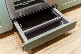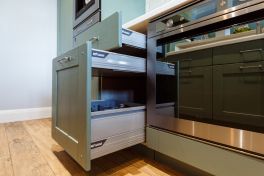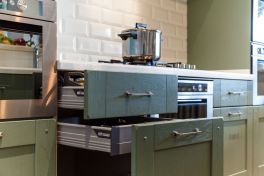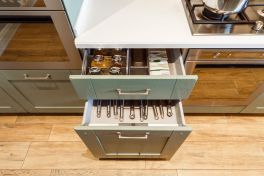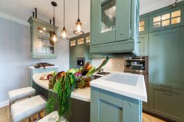 Столешница и интегрированная литая мойка с декоративной кромкой изготовлены из искусственного камня белого цвета. Столешница острова бежевого оттенка и изогнутой формы – так гораздо удобнее для общения. Кухонный гарнитур пепельно-зеленого цвета разбит на две части – основную рабочую зону с техникой и остров-барную стойку с мойкой. . Мебель выполнена из древесно-стружечных плит с ламинацией. Основная рабочая зона представляет собой линейную композицию, в центре которой находятся варочная поверхность, духовой шкаф и встроенная вытяжка. Полки для посуды и кухонной утвари расположены в два ряда: весь верхний ряд антресолей – со стеклом, нижний ряд – с глухими фасадами и меньшей глубины. Дубовые рамки немного стесаны по углам и украшены деревянным гвоздиками, как будто их сделали не на производстве, а сколотили вручную. Все ящики и шкафы оснащены доводчиками, ручки – цвета «античное серебро». На кухне предусмотрено много эргономичных систем хранения. Ящики оснащены мобильными держателями для тарелок и специй, разделителями для хранения посуды и столовых приборов, отсеками для мелочей, держателями для ножей, фольги и пищевой пленки. Под духовкой находится двойной ящик для сковородок – теперь ставить друг на друга их не придется, и покрытие не повредится. Остров объединяет барную стойку, мойку, высокие напольные шкафы и самые интересные предметы гарнитура – подвесные модули-витрины. Четыре стержня пронизывают парящие шкафы насквозь, делая конструкцию надежной и безопасной. Шкафы напоминают огромные старинные фонари с рельефным стеклом на фасадах. Справа от мойки скрывается посудомоечная машина, с другой стороны – вместительная сушка и отделение для хранения столовых приборов. Барная стойка позволит комфортно разместиться и быстро перекусить.